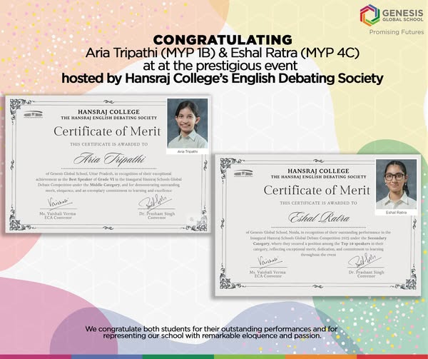 Happy to share that Eshal Ratra (MYP 4C) has been awarded a Certificate of Merit, earning a well-deserved place among the Top 10 Speakers in the Secondary Category at the prestigious event hosted by Hansraj College’s English Debating Society. Adding to this success, Aria Tripathi (MYP 1B) has been honoured with the ‘Best Speaker Award […]