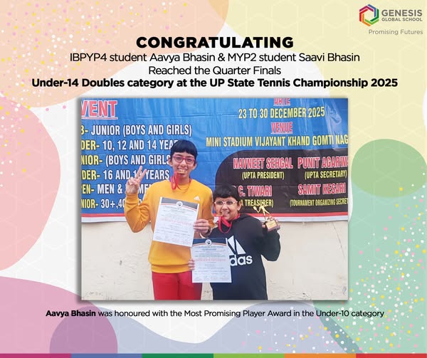 Excited to share that IBPYP4 student Aavya Bhasin was honoured with the Most Promising Player Award in the Under-10 category, and MYP2 student Saavi Bhasin along with Aavya, showcased great teamwork and determination by reaching the Quarter Finals in the Under-14 Doubles category at the UP State Tennis Championship 2025, held in Lucknow recently.
